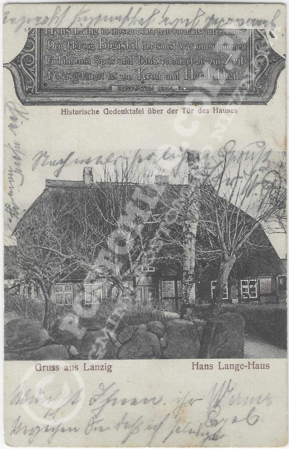 Oryginalny napis: Gruss aus Lanzig – Hans Lange Haus – Historische Gedenktafel über der Tür des Hauses
