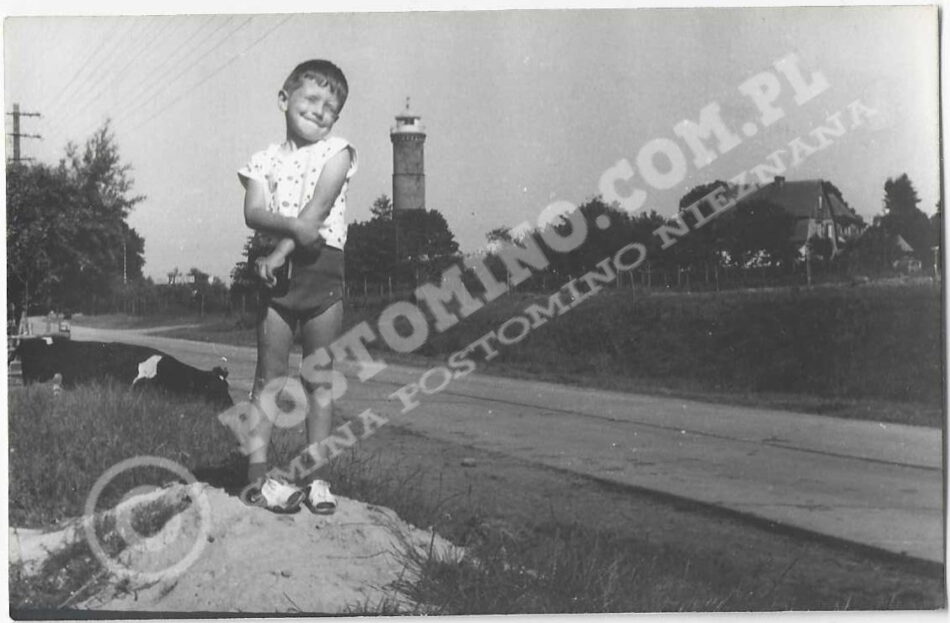 Jarosławiec ulica Bałtycka, Zdjęcie chłopca, w tle Latarnia Morska oraz nieistniejąca restauracja Witt.