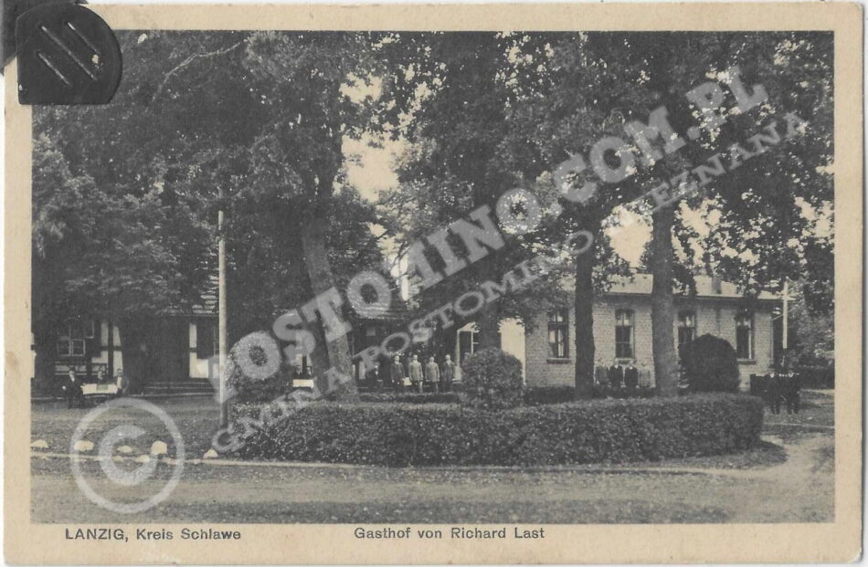 Oryginalny napis: Lanzig, Kreis Schlawe – Gasthof von Richard Last