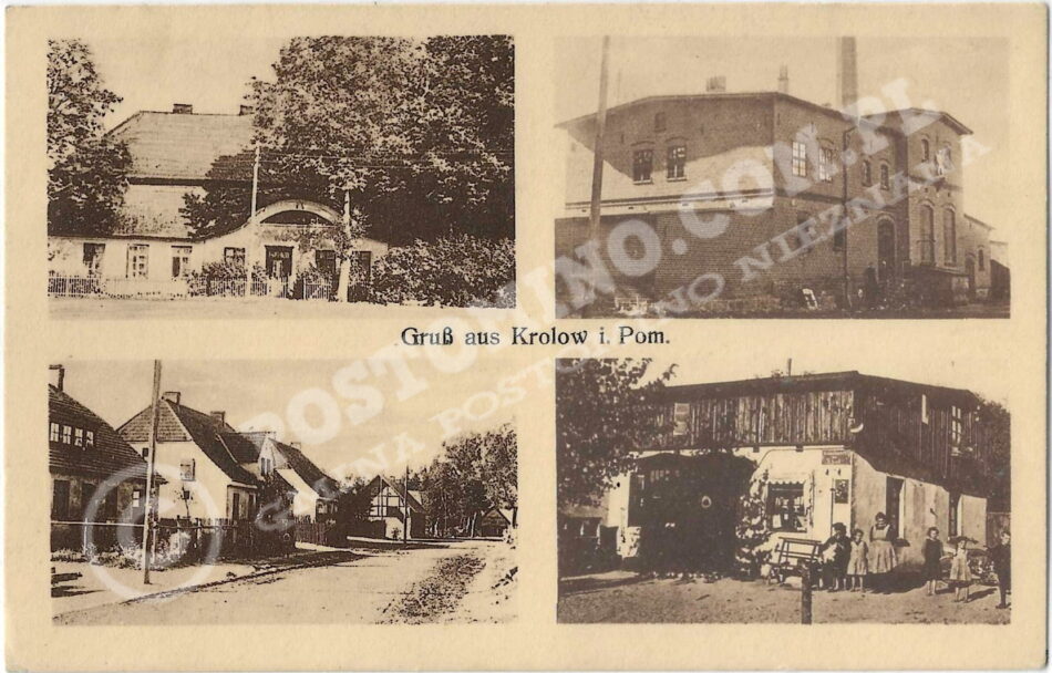 Oryginalny napis: Gruss aus Krolow i. Pom. – Schloss – Dorfstrasse – Kolonialwarenhandlung