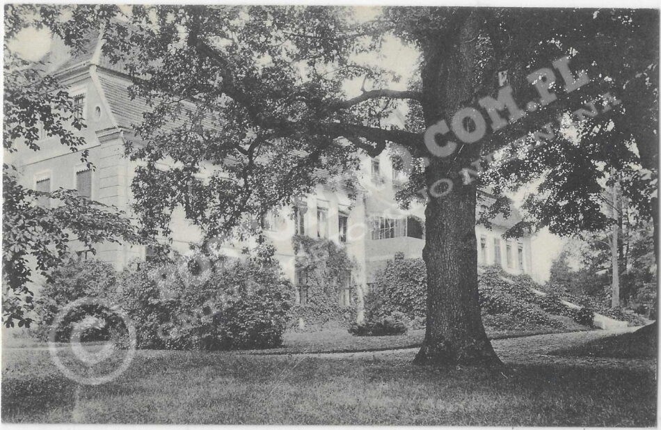 Pałac w Postominie widok z parku, Kartka pocztowa z Postomina przedstawia nieistniejący pałac wraz z otaczającym go parkiem przed pałacem.