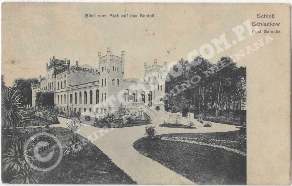 Oryginalny napis: Schlos Schlackow Post Saleskie – Blick vom Park auf das Schloss