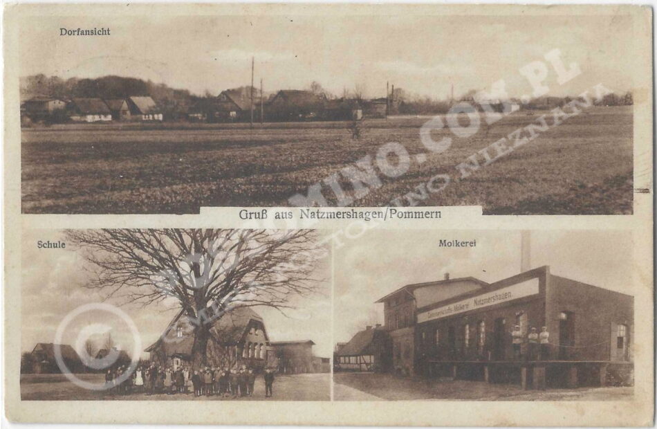 Oryginalny napis: Gruss aus Natzmershagen / Pommern – Dorfansicht – Schule – Molkerei