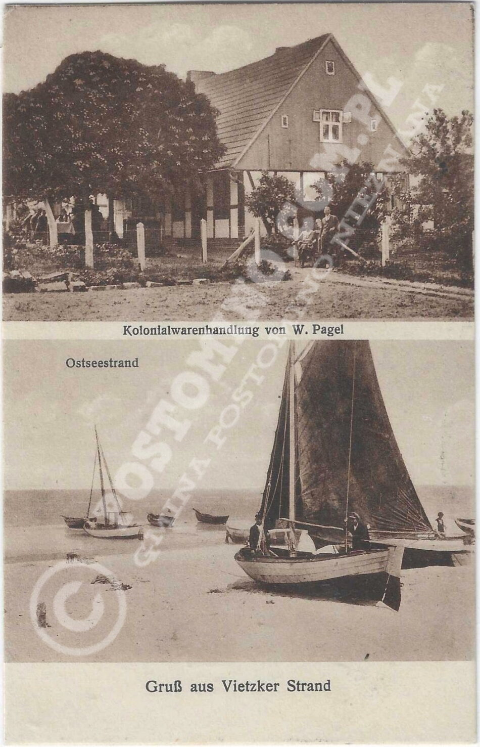 Oryginalny napis: Grusss aus Vietzker strand – Kolonialwarenhandlung von W. Pagel – Ostseestrand