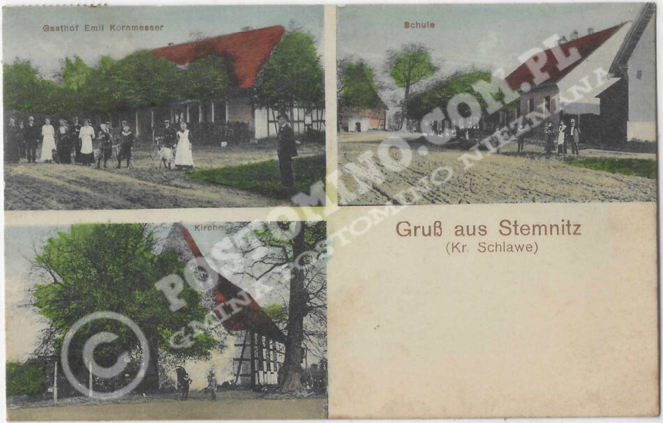 Oryginalny napis: Gruss aus Stemnitz Kr. Schlawe – Gasthof Emil Kornmesser – Schule – Kirche