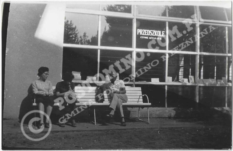 Przedszkole w Jarosławcu, Zdjęcie kuracjuszy odpoczywających na ławeczce oraz budynku przedszkola na terenie ośrodka wczasowego Bałtyk.
