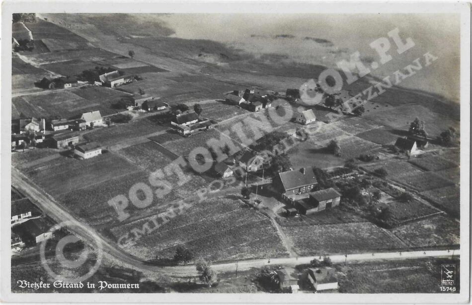 Wicko Morskie z lotu ptaka, Kartka pocztowa z widokiem lotniczym na jezioro Wicko, Szkołę, pocztę i spółdzielnię rybacką.