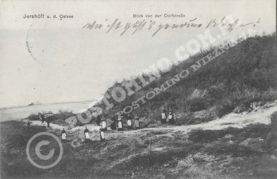 Widok z ulicy wiejskiej, Jarosławiec ( Jershöft ) pocztówka. Widok z ulicy Nadmorskiej, zejście na plaże przy molendówce na obecną sztuczną plażę Dubaj. ( Plaża w Jarosławcu – Jershöft, zdjęcie z 1896 roku pokazuje nam to samo miejsce widziane od strony plaży.)